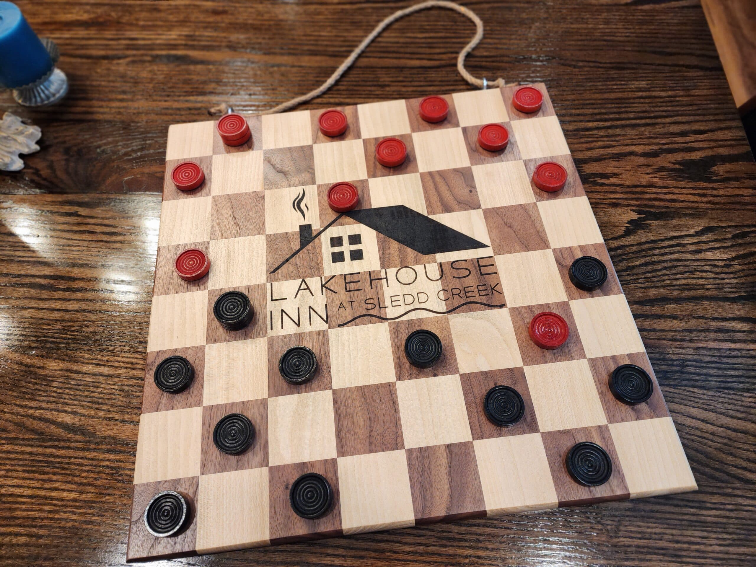 This art is meant to help you pass the time! Yes, I was scrolling (which is a big waste of time but wow I’ve found some cool people), and found Circle K Creations | Metropolis IL. A post with serving boards and butcher block style cutting boards caught my eye – and I thought, “What if they made a checkerboard for the lobby?” They were happy to craft my custom order! (The logo is a nice touch, don’t you think?)