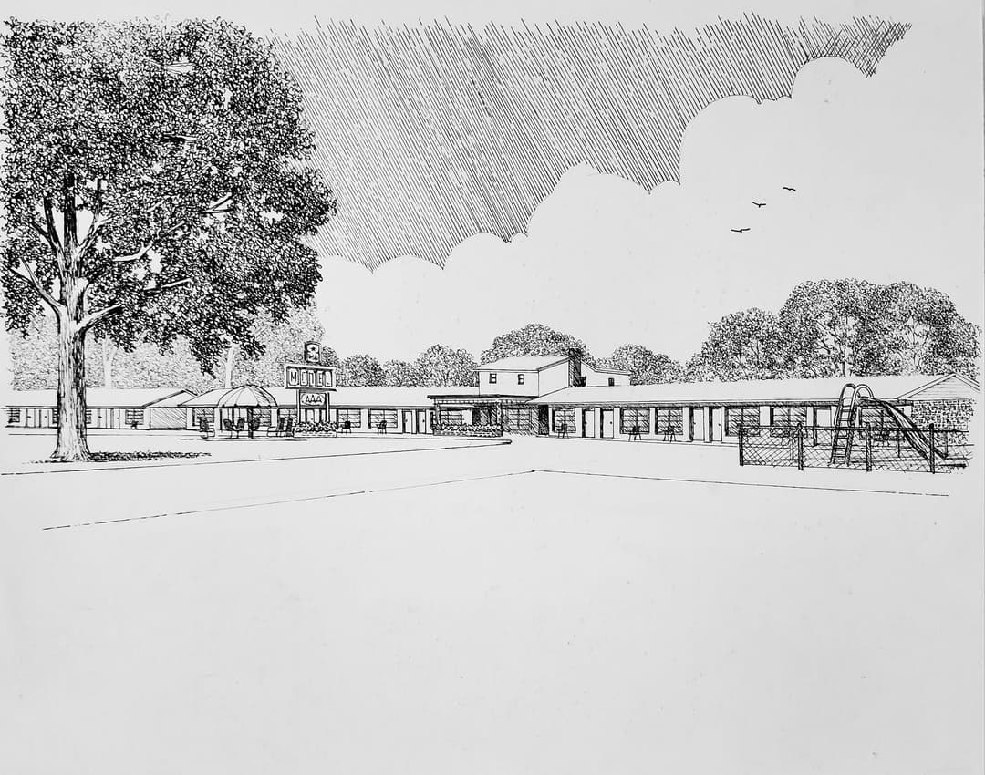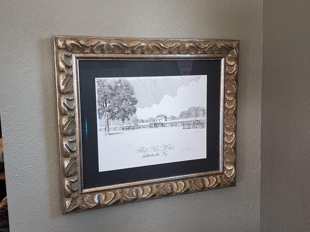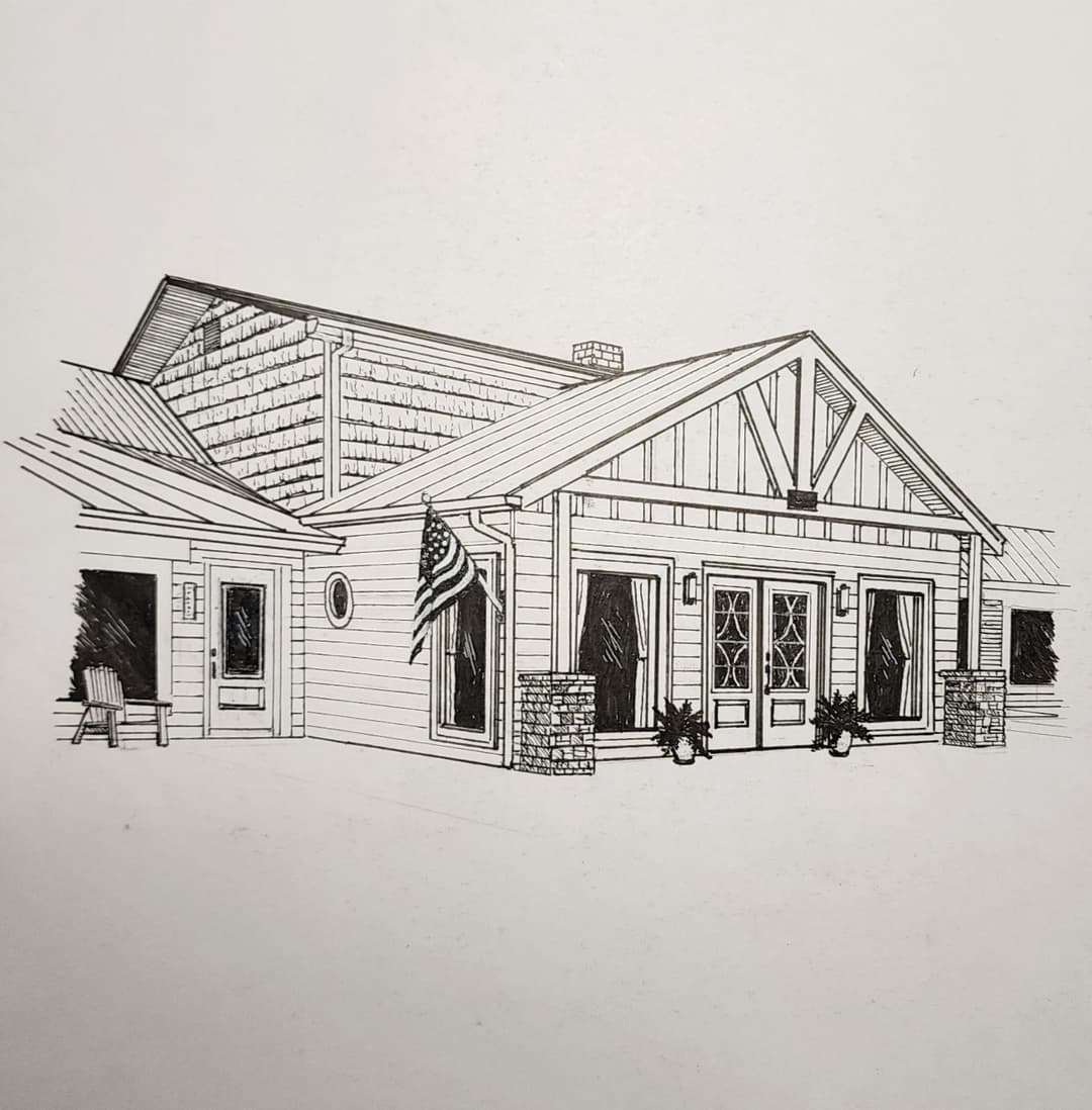 We were tearing so much of the old motel out and I wondered if any of the previous owners were feeling sad about the changes. (I’d be sad if someone totally overhauled a place I loved!) I reached out to Ms. Linda and sent her some photos and postcards of the Bel Air back in the 1960’s and she created the perfect depiction of the old motel! I loved it so much that I asked her to do a drawing of the newly remodeled lobby area to use on this year’s t-shirts. Stop by and pick up some Lakehouse Inn merch on your next trip to Kentucky Lake!