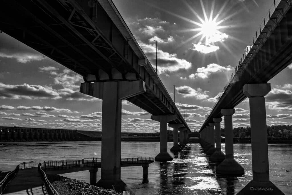 “In the area below Kentucky Dam, a highway bridge and a parallel railway bridge were built by the U.S. Army Corps of Engineers in 2009 to move traffic off the Dam in preparation for a new lock that was built. At that time, it was a $200 million dollar project. I love this shot, and the area is a great place to watch barge traffic using the dam locks.”
